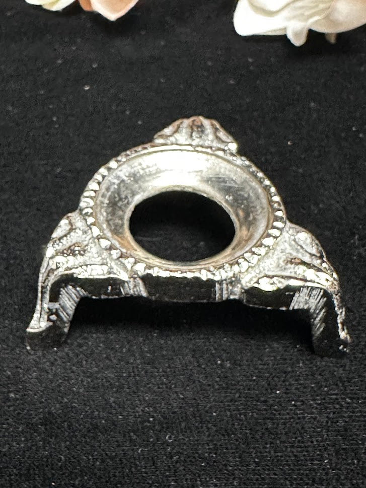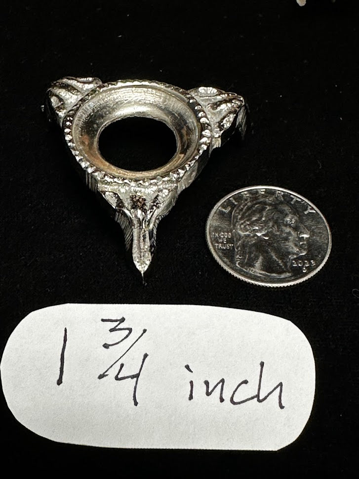 This is a silver color ornate style sphere and egg stand. This style of stand adds style to enhance the beauty showing off your stone. This stand can handle up to a 3 inch to 3.5 max inch sphere. Any larger the sphere WILL ROLL OUT!