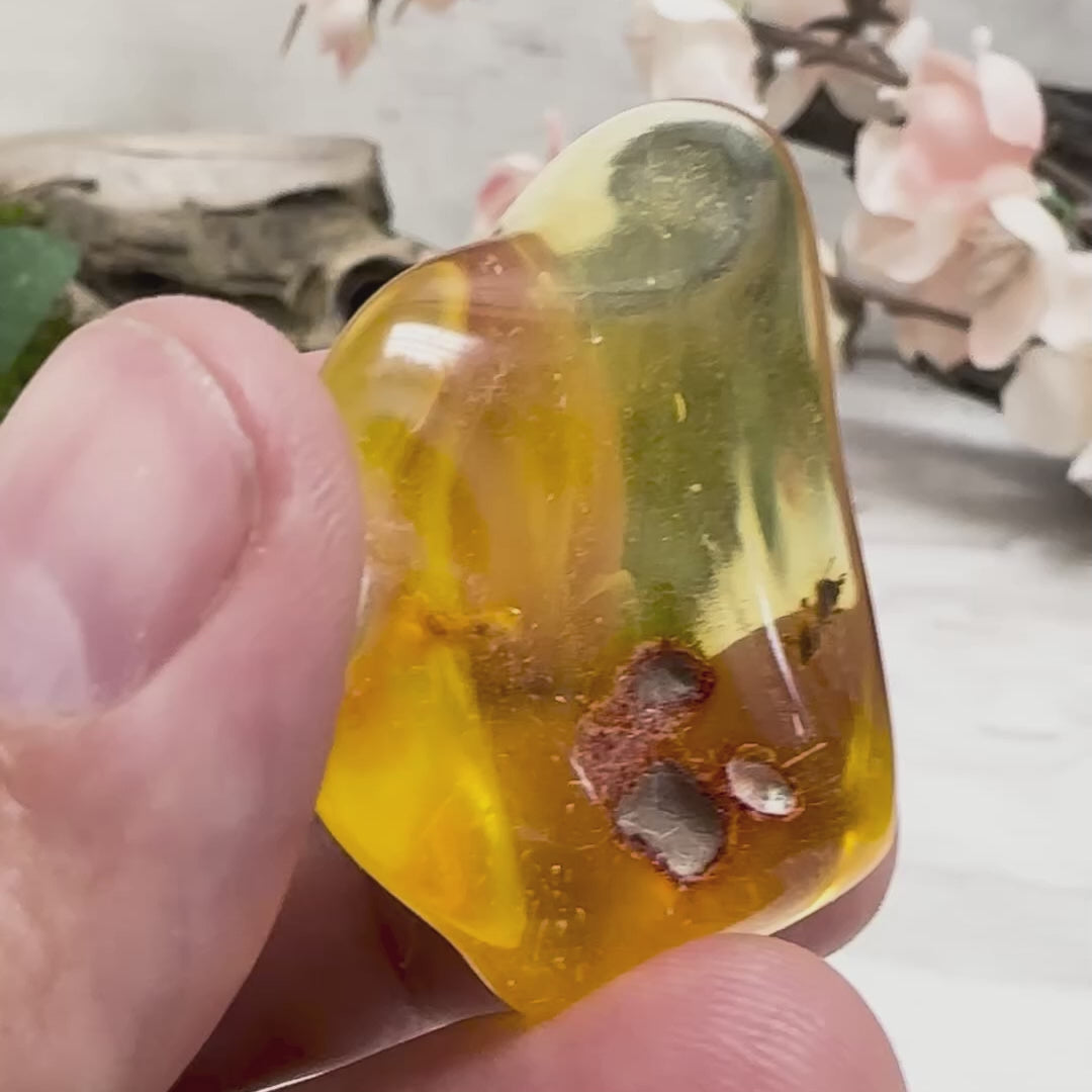 Amber is an organic gem. Organic gems are the products of living or once-living organisms and biological processes. Amber formed tens of millions of years ago when sap from ancient trees hardened and fossilized. Scientists and collectors treasure amber that contains suspended animal or plant fragments.