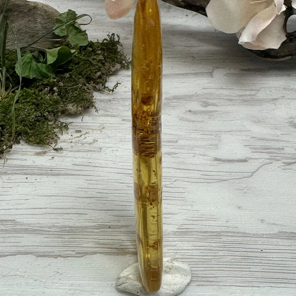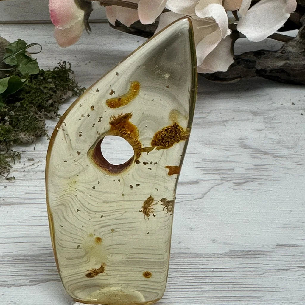 Amber is an organic gem. Organic gems are the products of living or once-living organisms and biological processes. Amber formed tens of millions of years ago when sap from ancient trees hardened and fossilized. Scientists and collectors treasure amber that contains suspended animal or plant fragments.