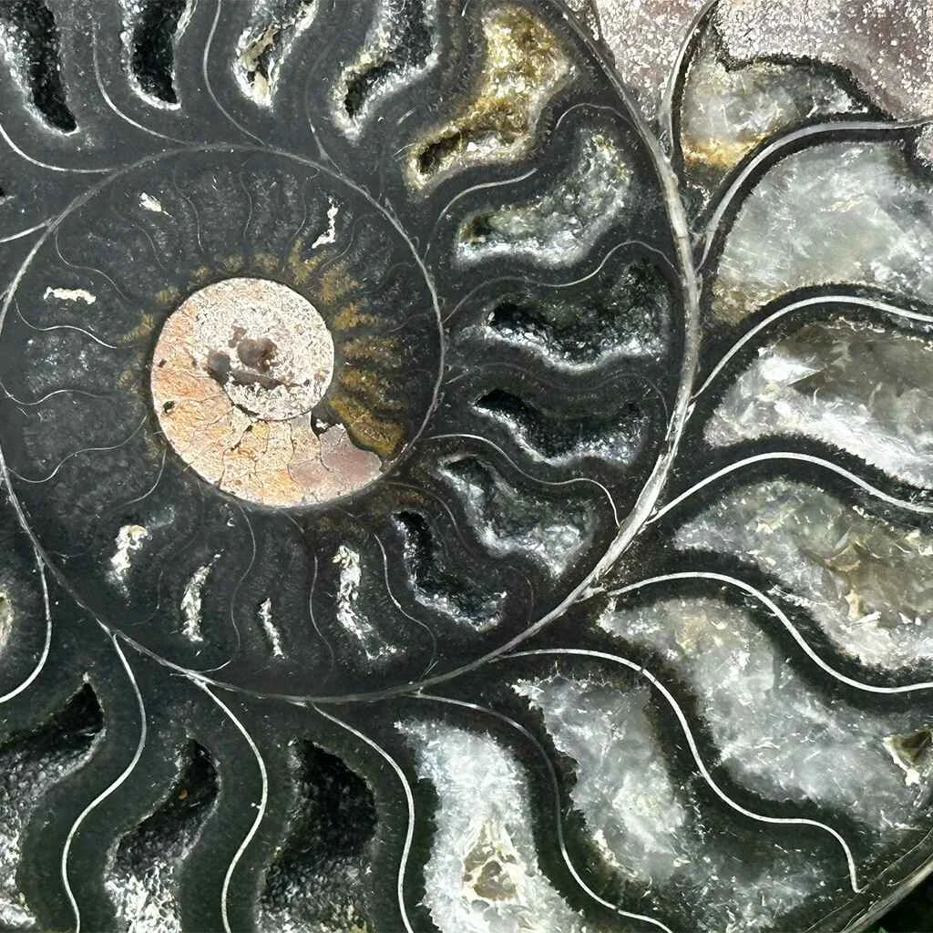 Ammonites are perhaps the most widely known fossil, possessing the typically ribbed spiral-form shell as pictured above. These creatures lived in the seas between 240 - 65 million years ago, when they became extinct along with the dinosaurs. The name 'ammonite' (usually lower-case) originates from the Greek Ram-horned god called Ammon. Ammonites belong to a group of predators known as cephalopods, which includes their living relatives the octopus, squid, cuttlefish and nautilus.